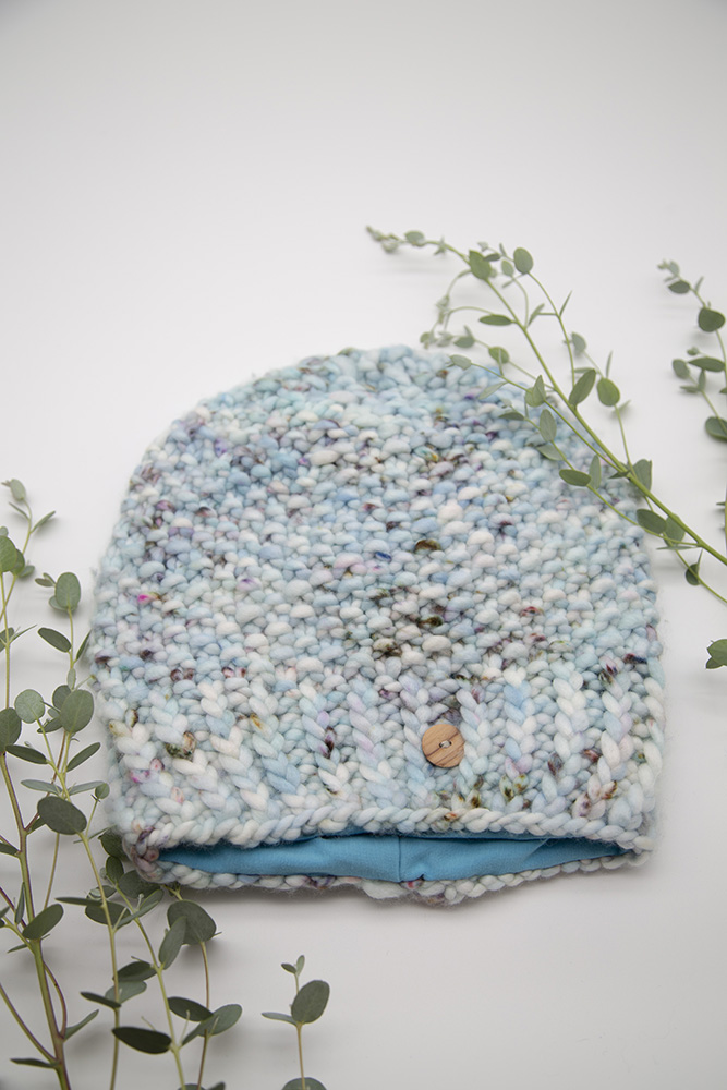 Hand-dyed wool gives a unique look. Colors flow in a unique way, often in soft pastel tones or interesting patterns that are difficult to replicate. The olive wood knob is a special detail that, with its irregular lines and patterns, adds a natural, rustic touch.