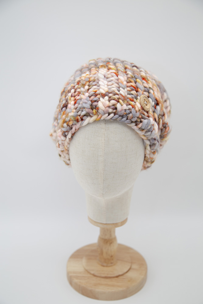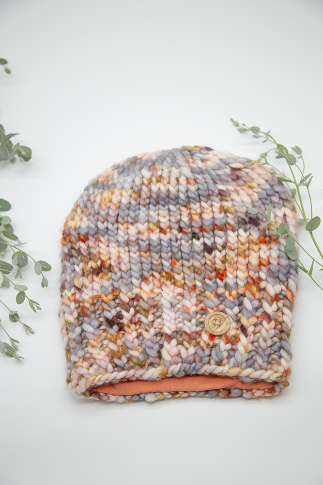 Hand-dyed wool gives a unique look. Colors flow in a unique way, often in soft pastel tones or interesting patterns that are difficult to replicate. The olive wood knob is a special detail that, with its irregular lines and patterns, adds a natural, rustic touch.